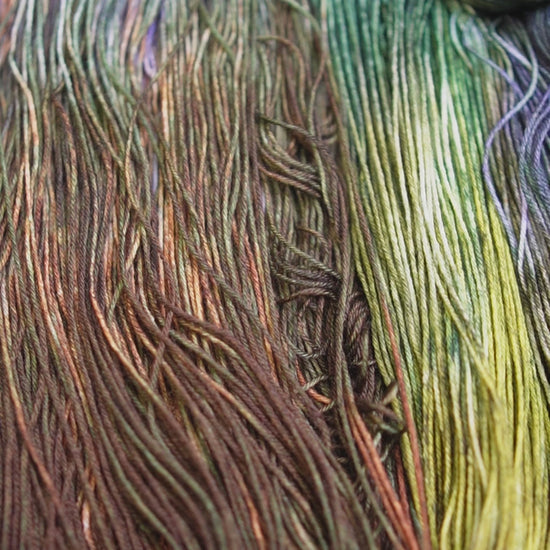 The forest floor comes alive in Mycelium Bloom - earthy browns, mossy greens, and unexpected pops of mushroom-inspired mauves and creams. Nature's hidden network of connection, translated into yarn. This sock set pairs our hand-dyed main skein with a coordinating solid mini for heels, toes, and cuffs that pop.